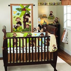 This 4-pc. crib bedding set from Bedtime Originals will look great in your child's jungle-themed nursery. He or she will love the cute monkeys on the flat sheet, comforter, and bumper. The tan-colored dust ruffle finishes off the look. These can be machine washed.